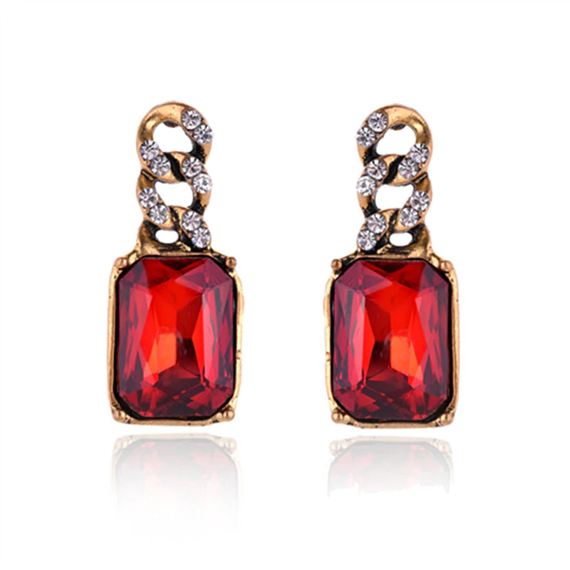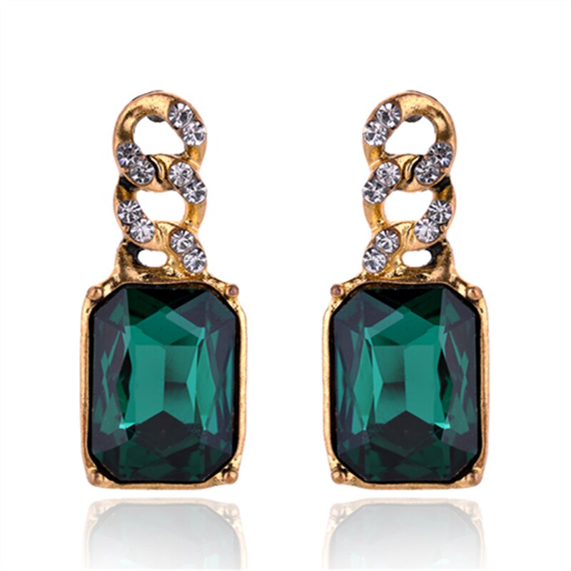 The elegant loop design focuses on the green rectangular-shaped emerald crystal. This is the perfect accessory for a party or casual wear. Also available in Ruby Red color.